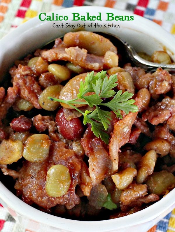 If you’re looking for a spiffed-up baked beans recipe, Calico Baked Beans has been one of my most requested recipes over the years. It’s truly delicious and not difficult to make either. This recipe is gluten free if your pork ‘n beans, bacon, and ketchup are gluten free.