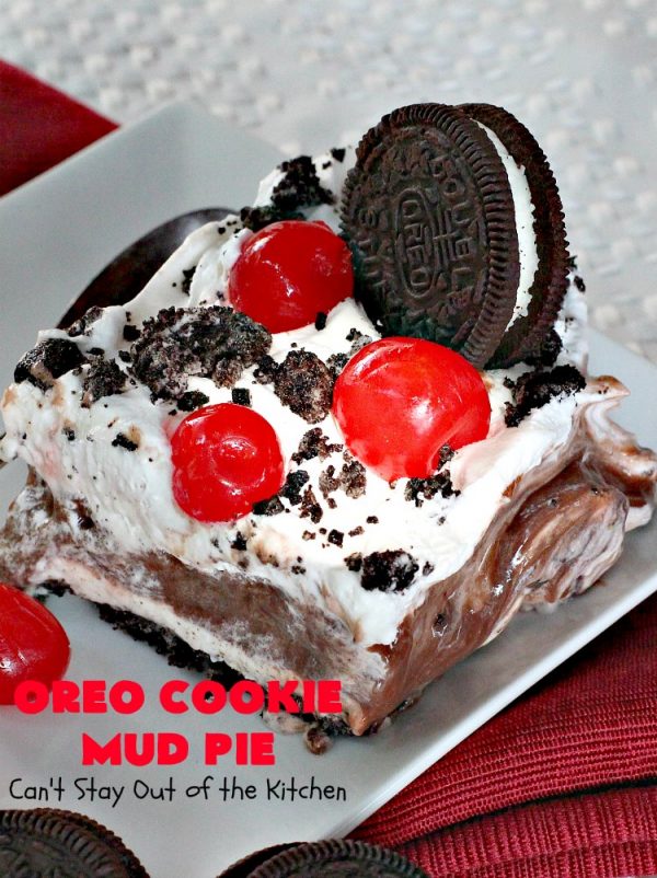 Oreo Cookie Mud Pie is spectacular! What’s not to love about Oreo cookies, chocolate pudding, a cream cheese layer, Cool Whip and maraschino cherries? This sumptuous dessert is sensational! Chocolate lovers are addicted to this amazing pudding-type recipe.