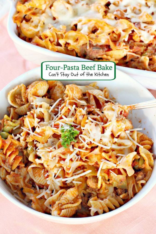 Four-Pasta Beef Bake is an excellent option for making a freezer meal. Cover and freeze before baking and then bake it a couple of hours or until done, straight from the freezer.