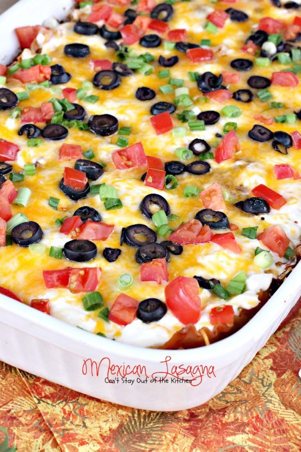 Mexican Lasagna is filled with a Tex-Mex style beef sauce, then it’s layered with sour cream, cheese, olives, tomatoes and green onions for incredibly wonderful taste.