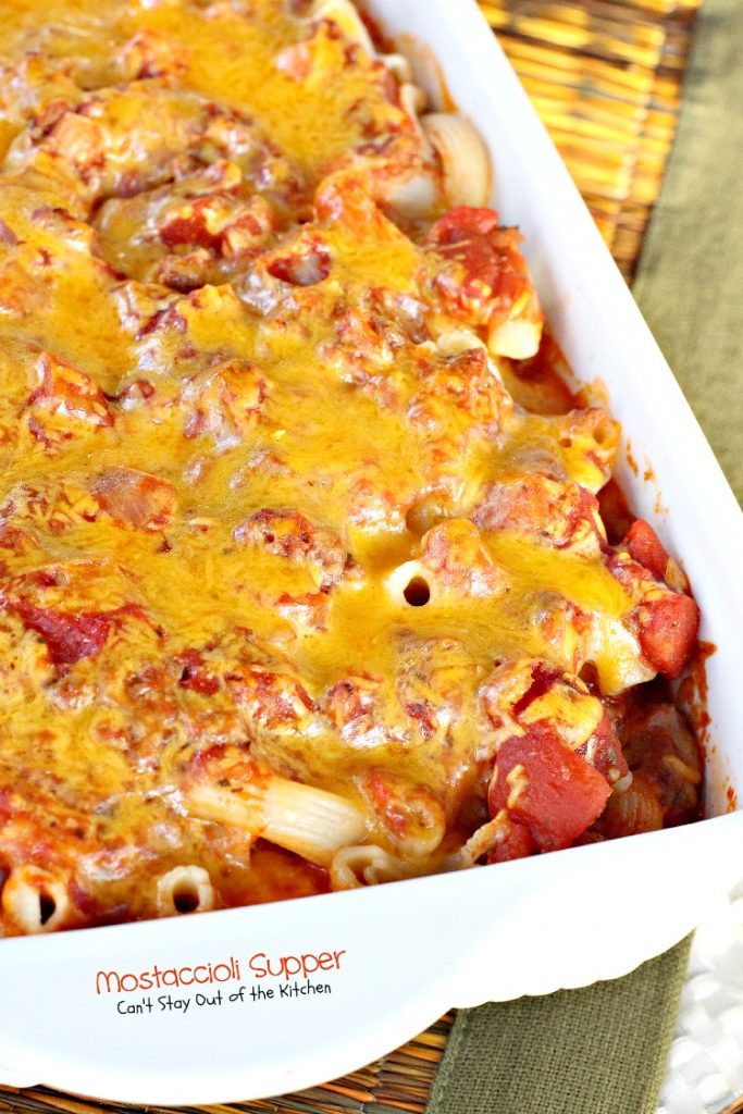 Mostaccioli Supper is a quick and easy casserole that’s kid friendly. It’s terrific for weeknight suppers.