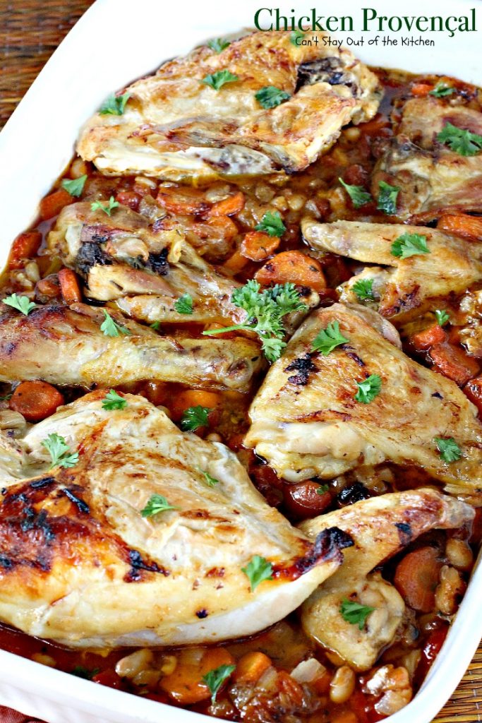 Chicken Provençal is a wonderful main dish entree using butter beans, carrots, onions, garlic and tomatoes. It is almost like a chicken stew except the chicken is not cut up in small pieces but left whole. It’s seasoned with thyme and oregano.