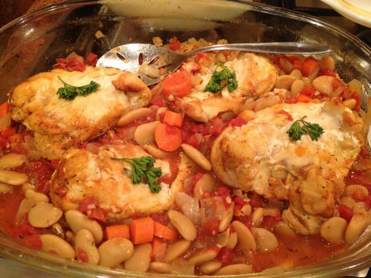 Chicken Provençal is made with butter beans, carrots, onions, garlic and tomatoes.