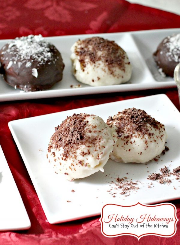 These beautiful jewels are fantastic! Holiday Hideaways have a maraschino cherry hidden away in the middle of each cookie. Then they’re covered with chocolate or vanilla bark coating. Finally, they’re sprinkled with chocolate or vanilla bark shavings. If you enjoy working with chocolate and vanilla bark you will love making these scrumptious cookies. The results are simply stunning.