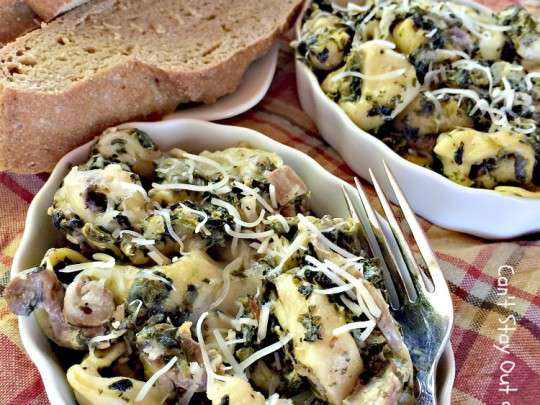 Fantastic Italian pasta dish features spinach, cheese tortellini, mushrooms and seven cheeses in an amped up Alfredo sauce. It's great for Meatless Mondays or company dinners. This comfort food entree is hearty, filling and so satisfying.