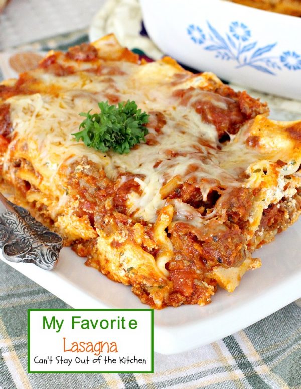 My Favorite Lasagna is so succulent and delicious. Serve with Easy French Bread and a side Greek Salad and you’re good to go!
