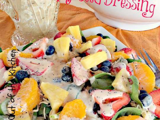 Spinach and Fruit Salad with Poppy Seed Dressing is one of our family’s favorite salad recipes. Many times I serve it with Maple Poppy Seed Dressing.