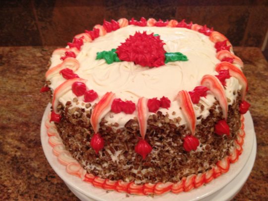 Here’s a picture of my delicious Red Velvet Cake. It is a moist cake and takes 2 batches of the regular cream cheese icing in order to get the rich, decadence this cake requires. Special thanks to Hannah Noice, Ovilla, Texas, for her inspiration and decoration of the cake.
