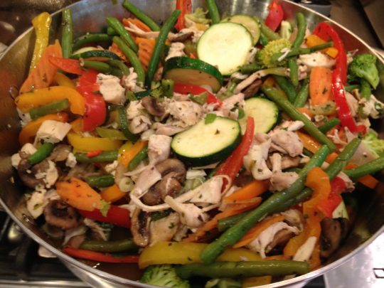 Add chicken strips. Stir and cover, stirring often until done and the veggies are crisp-tender. Don’t overcook.