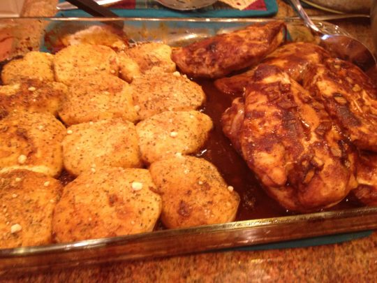 This fantastic entree features barbecued chicken that’s baked in the oven, so it’s great to make in the winter when you don’t particularly want to light up your outside grill in freezing weather! Then after baking the chicken you roll refrigerated biscuits into the barbecue sauce in the pan. Turn the biscuits sauce-side-up, and sprinkle them with Italian seasoning and parmesan cheese. They’re absolutely mouthwatering.