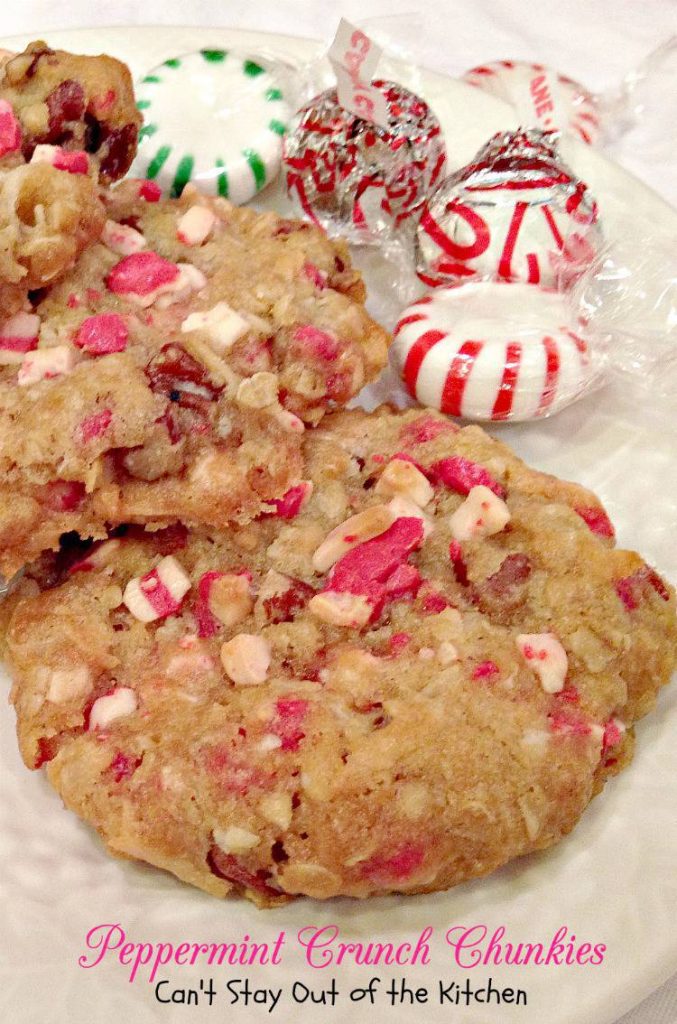 I love this fantastic Peppermint Crunch Chunkies cookie recipe. It has lots of Andes peppermint pieces, coconut, oatmeal, and pecans and it bakes up into a really fabulous cookie. I have made it mixing all the pieces into the batch and baking like that, or placing extra peppermint pieces on top before baking.