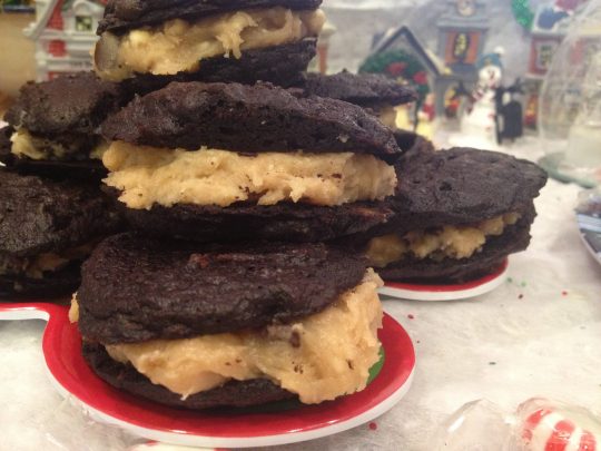Chocolate Chip Cookie Dough Whoopie Pies are to die for! Rich, decadent, amazing! I found this amazing cookie last summer and finally got around to making it for the holidays. I took it last night to our church’s holiday fine arts and music gala. I had 2 dessert tables loaded down with assorted Christmas cookies for folks to enjoy during intermission. I had several people rave about this cookie and others wanted to take them home to eat.
