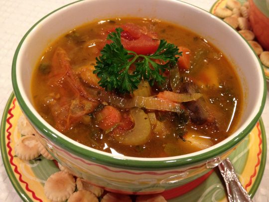 Lots of chunky roasted vegetables are in a delicious broth. This soup is rather easy to put together. Chopping the vegetables is the only labor-intensive part.