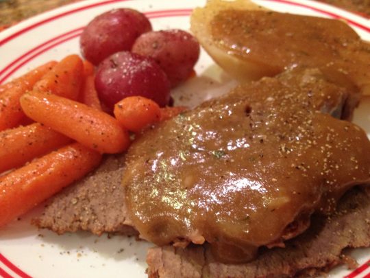 Here’s a simple, gluten free way to make pot roast, gravy, potatoes and carrots for a complete dinner.