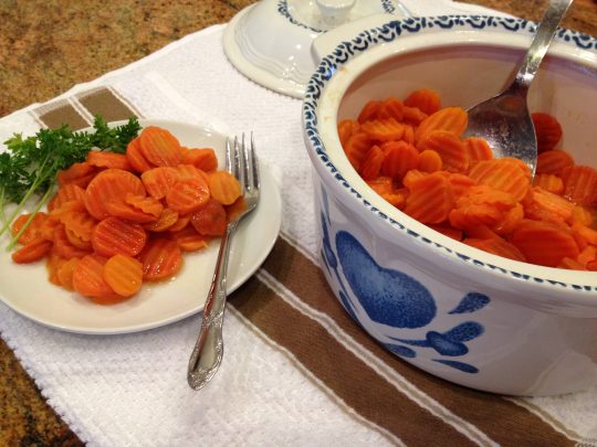 Here I’ve served the carrots. You will need to stir well before dishing out each serving to make sure the carrots get plenty of the butter/brown sugar/honey mixture.