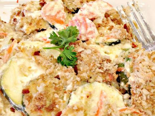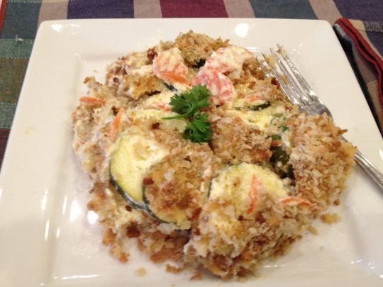 There are lots of delicious zucchini and carrots in a creamy sauce and covered in stuffing mix in this recipe.