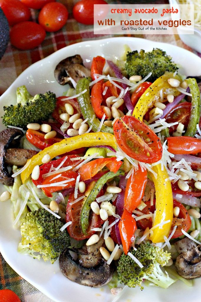 Creamy Avocado Pasta with Roasted Veggies is an amazing Meatless Monday recipe. It has pasta, a creamy avocado-garlic-lemon sauce, lots of roasted vegetables and then it’s sprinkled with pine nuts and Parmesan cheese. Oh, my! It’s also a very delectable, succulent, and vegetarian feast!