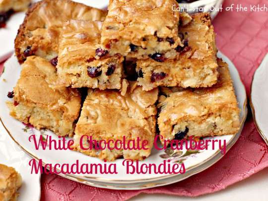 White Chocolate Cranberry Macadamia Blondies have lots of white chocolate drops, craisins and macadamia nuts in every bite. Oh, my! Better be careful sharing these or you won’t have any left!