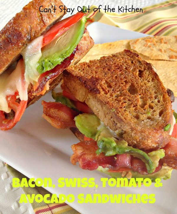 I served Bacon, Swiss, Tomato and Avocado Sandwiches with flatbread chips and cantaloupe. This recipe isn’t difficult. You just have to be patient and cook at a lower temperature so the cheese melts and the bread doesn’t become scorched.