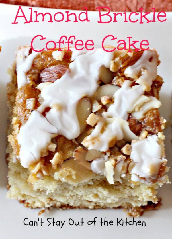 Almond Brickle Coffee Cake | Can't Stay Out of the Kitchen | this spectacular #CoffeeCake absolutely rocks! It's made with #almonds & #HeathEnglishToffeeBits. Every bite will have you drooling. Terrific for a #Holiday or company #Breakfast or for #Dessert. #Easter #cake #HolidayDessert #EasterDessert #MothersDayDessert #AlmondDessert #ToffeeDessert #AlmondBrickleCoffeeCake #LandOLakes
