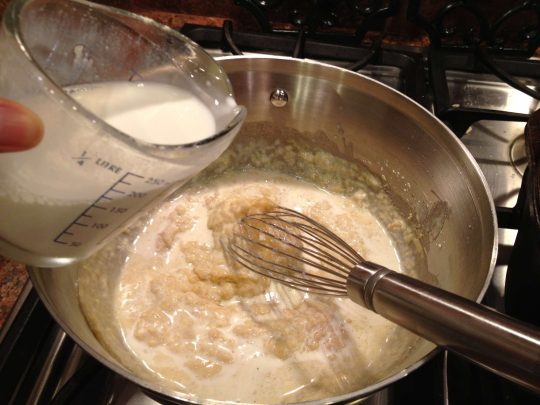 - Add half-and-half about a quarter cup at a time and whisk each addition completely into the sauce until all of the half-and-half is used up.