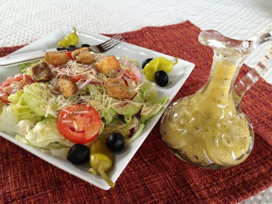 I was in the mood for Olive Garden Salad last week but I didn’t want to go out to eat. Yes, I had bottles of Olive Garden salad dressing in my refrigerator and on my pantry shelves. But I wanted to try a homemade version instead. I wondered how the copycat versions available tasted. Were they close to the original salad dressing in flavor?