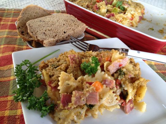 Creamy Ham, Veggie and Noodle Bake has always been one of our family’s favorite main dish casserole recipes. The recipe is topped with buttered Italian bread crumbs which gives the casserole so much additional flavor!