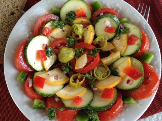 Marinated Squash and Tomato Salad complements any main dish meal. It’s also great to serve for lunch.