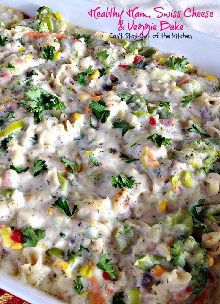 Healthy Ham, Swiss Cheese and Veggie Bake | Can't Stay Out of the Kitchen | healthier #casserole made with NO canned soups. #ham #veggies #pasta