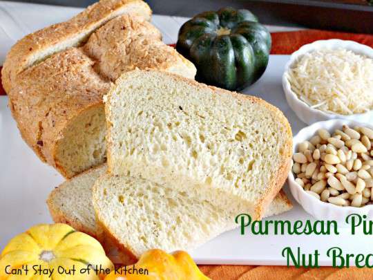I love Parmesan Pine Nut Bread! I made a batch of this delicious bread for company a few weeks ago. It turned out spectacularly. No kidding. I really enjoy Greek or Italian-type breads anyway. This great recipe includes Parmesan cheese, pine nuts and Italian seasoning, which provide really nice flavors and depth to the bread.