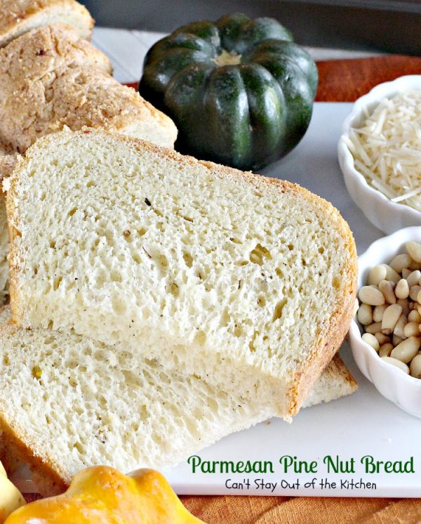 Parmesan Pine Nut Bread is wonderful served with an Italian-type meal. I served it with Chicken Parmesan Casserole, several different Tomato Tarts, and Pumpkin Nachos! The crunchiness from the nuts and the savory flavors from the cheese make for an excellent tasting bread.