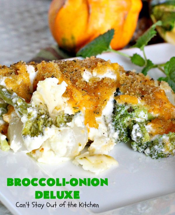 Lots of broccoli and pearl onions are covered in a rich, thick creamy sauce. The sauce is topped with cheddar cheese and Italian bread crumbs. What a wonderful combination of flavors!