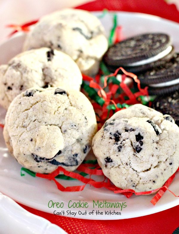 Oreo Cookie Meltaways are marvelous. What’s not to love about a cookie with Oreos in it? These are melt-in-your-mouth sugar cookies for sure. Then they’re stuffed with Oreo cookie chunks. They are sweet, rich, decadent, chocolatey, and have wonderful texture.
