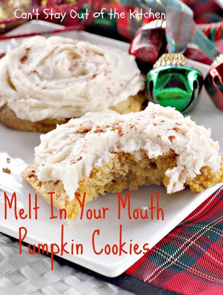We made fifteen different cookies this year, and Melt In Your Mouth Pumpkin Cookies were the rage from everyone! These luscious pumpkin cookies turned out so marvelously. They have a nice pumpkin and cinnamon flavor and then they’re iced with an amazing brown sugar buttercream frosting with a touch of cinnamon on top.