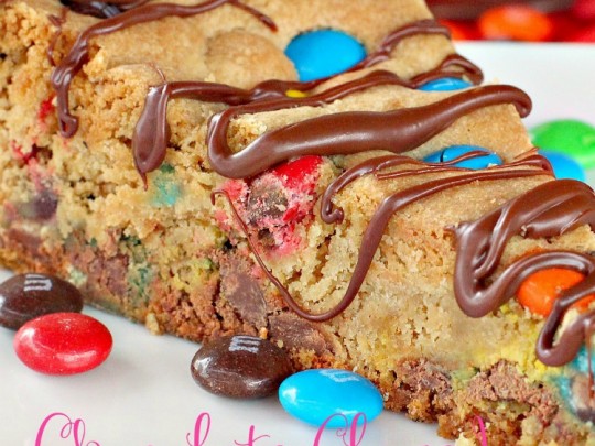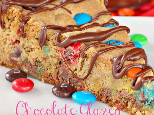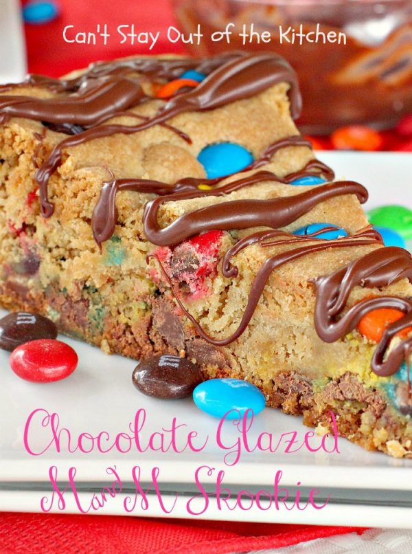 Chocolate Glazed M&M Skookie is a mouthwatering chocolate chip cookie-type recipe. Chocolate chips and vanilla chips melted together are drizzled over the top. Yum.