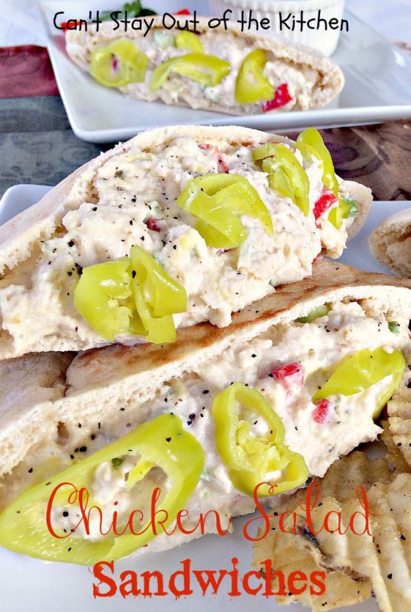 This close up shows the texture of Chicken Salad Sandwiches. I served these Chicken Salad “Sandwiches” in pita pockets garnished with sliced pepperocinis because I ran out of salad pepper rings.