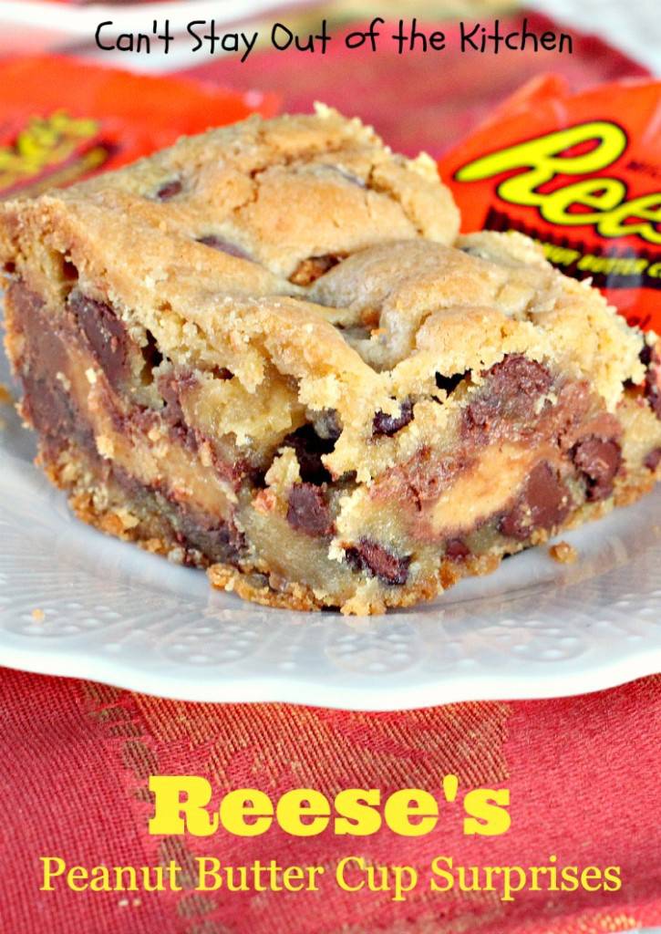 Reese’s Peanut Butter Cup Surprises are marvelous tasting brownies! These luscious bars have Reese’s Peanut Butter cups hidden inside. They’re tucked between two layers of Mrs. Field’s Chocolate Chip Cookie Copycat Recipe cookie dough. Are they ever yummy!