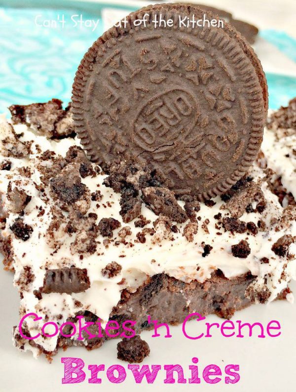 Cookies ‘n Creme Brownies are great to whip up for any occasion. They are especially good for parties, special occasion baking like Valentine’s Day or other holidays. When you want to WOW your company with your latest culinary creation, make a batch of these brownies! Better grab one quickly, though, before they’re all gone!