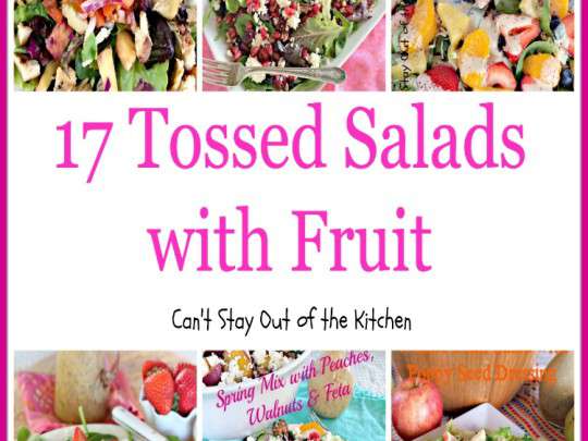 I have to admit I have a penchant for green salads with fruit in them! All kinds of fruit–berries, peaches, pears, apples, pineapple–I’ve got recipes that feature all of these and more! All of these featured 17 Tossed Salads with Fruit are fantastic. Many of them have their own homemade salad dressings which are usually along the healthy side. All but one recipe is gluten free. I use Cherry Preserves in my Harvest Turkey Salad with Cherry Vinaigrette and I’m not sure if flour or cornstarch is used as a thickener in that product, so I refrained from calling that recipe gluten free. Although, I’m sure you can find some Cherry Preserves that are gluten free.