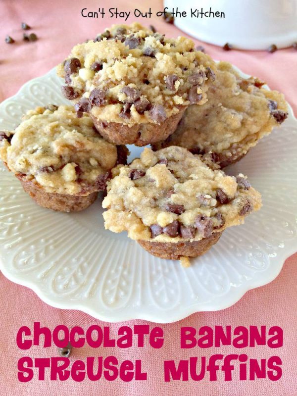 Chocolate Banana Streusel Muffins are irresistible. Seriously! These lovely muffins have bananas and cinnamon in the batter. Then they’re topped with a streusel made from butter, brown sugar and miniature chocolate chips. When the streusel topping bakes, it turns into a wonderful toffee flavor. That toffee flavor along with the chocolate chips is nothing short of sensational.