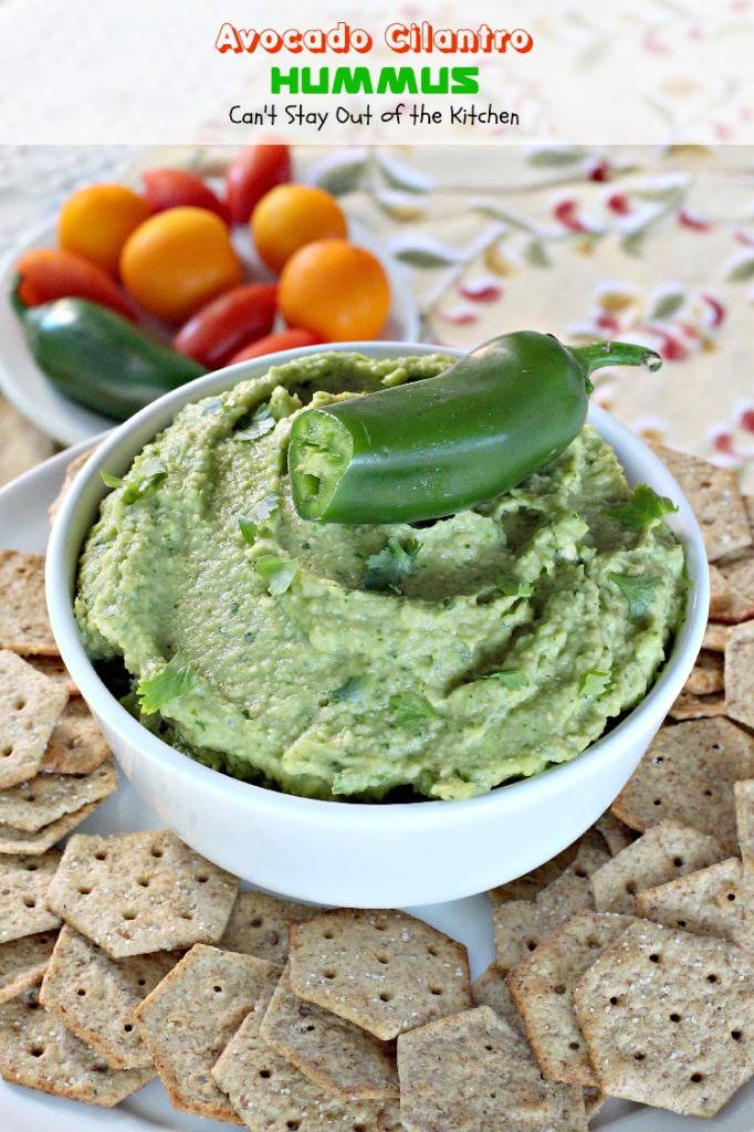 Avocado Cilantro Hummus is a delightful appetizer that’s great for any tailgating party. I love avocados. Guacamole is one of my favorite foods. I can eat avocados raw and plain, in tossed salads, marinated salads, pasta salads, appetizers, layered dips, sauces with pasta, sandwiches and, of course, in Taco Salads.