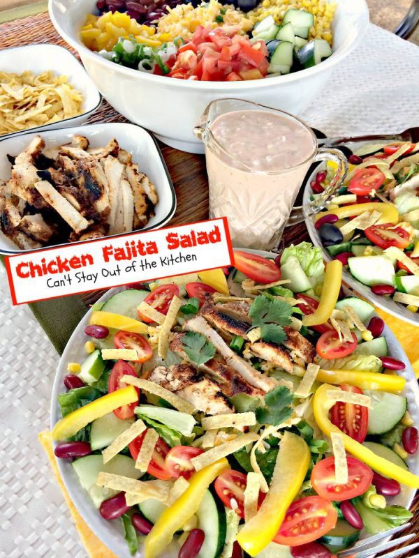 If you’re looking for a fabulous salad to serve your family or for company, Chicken Fajita Salad is as good as it gets! This salad is great with a Salsa Ranch Dressing like I used or a Honey-Chipotle dressing with a little zip. But Ranch or Catalina dressings will work fine, too. Give Chicken Fajita Salad a try. You will savor every delicious bite.