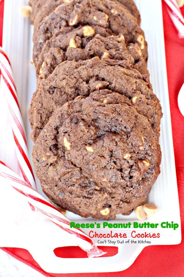 These are lovely chocolate cookies. Plus they supply a needed dose of peanut butter as well. Consider making up a batch of Reese’s Peanut Butter Chip Chocolate Cookies for your holiday party or Christmas Cookie Exchange. The combination of flavors is incredible and everyone always loves them.