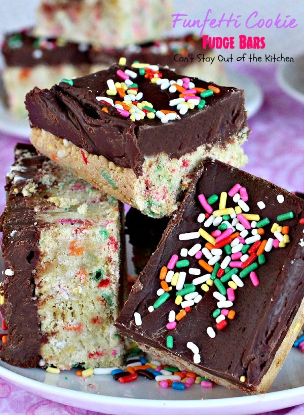 Funfetti Cookie Fudge Bars are so much fun. I’m a funfetti and sprinkles girl. Really. I love bling on clothes and shoes and I certainly love it on food as well. 🙂 So anytime it’s in cakes, pies, cookies, pancakes or other desserts I’m all for it. Funfetti Cookie Fudge Bars have plenty of funfetti sprinkles in the brownie part and then they’re sprinkled on top of the fudgy frosting as well. Drool. Sigh. So I’m all for ’em!