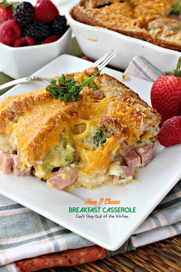 Ham and Cheese Breakfast Casserole is a terrific holiday breakfast casserole. It’s a tasty breakfast dish that’s the very first breakfast casserole recipe I every tasted and collected. Ham and Cheese Breakfast Casserole uses bread on the bottom and top and has ham, cheese, broccoli and an egg filling that provides that souffle-type texture. Yep, it’s amazing.