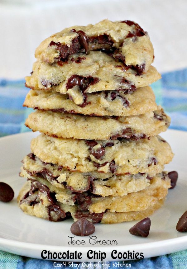 Ice Cream Chocolate Chip Cookies are special. If you’re looking for a fabulous cookie to make anytime you need a chocolate (or ice cream) fix, this is the cookie for you! But be prepared to have to make another batch right away. After all, everyone will want 3 or 4 or 5 or…. more of these lovely cookies.