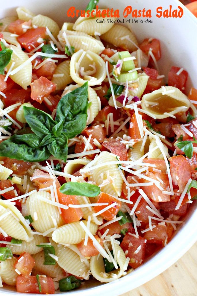Bruschetta Pasta Salad is a great recipe for backyard barbecues, summer holiday menus, or potlucks.