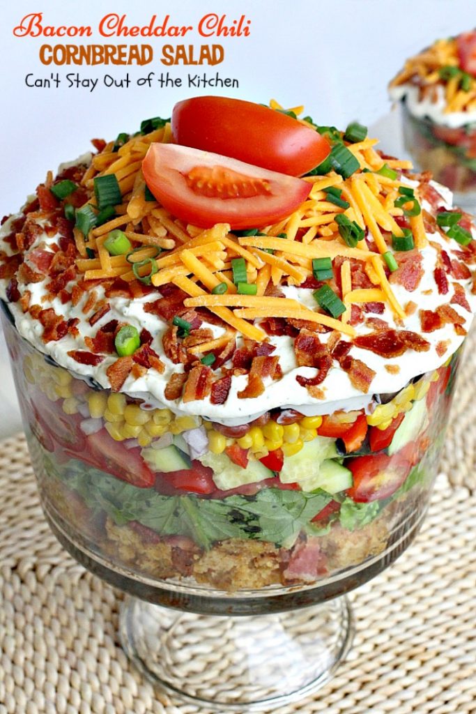 If you’re looking for a new salad to wow your company, give Bacon Cheddar Chili Cornbread Salad a try.