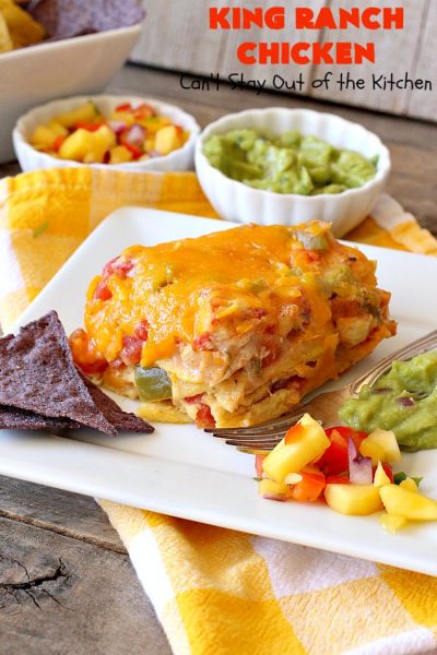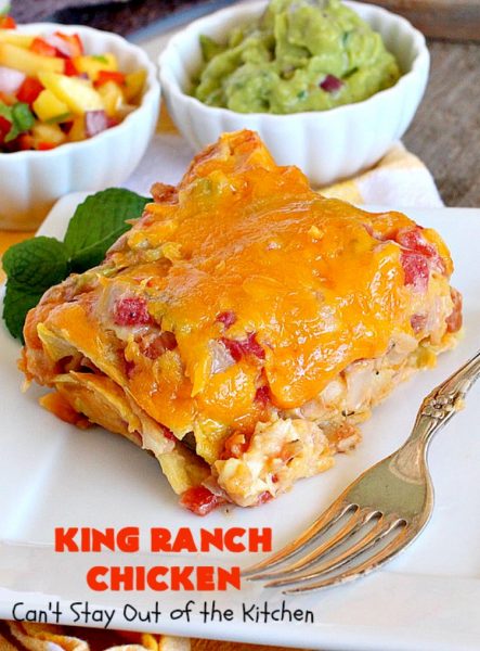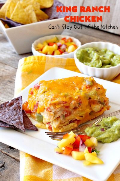 King Ranch Chicken is absolutely spectacular. This cheesy chicken dish is first rate. We enjoy it with Mango Salsa and Homemade Guacamole.
