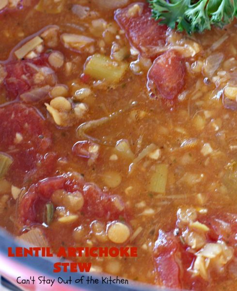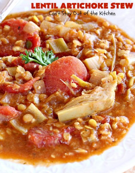 Lentil Artichoke Stew is healthy, low calorie and delicious. You can’t beat that!